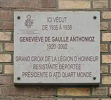 Commemorative Plaque at the home of Geneviève de Gaulle, 10 rue de Robin, Rennes.