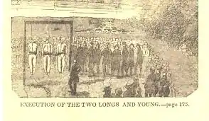 The October 1845 hangings of Granville Young and John and Aaron Long, Banditti murderers of Colonel George Davenport, from the 1850 book The Banditti of the Prairies, Or, The Murderer's Doom!!: A Tale of the Mississippi Valley by Edward Bonney, who is standing to the right of the gallows, wearing a top hat and black suit.