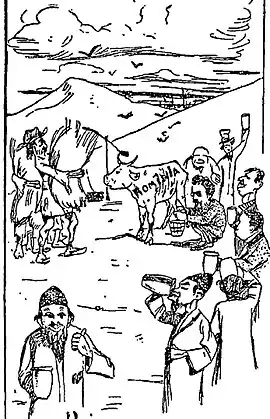 The "Sotir Hall Ideal", satirized by the antisemitic press (May 1896): socialists and Jewish Romanians milking a cow stamped "Romania", which is fed by an overworked peasant