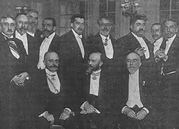 The Romanian delegation and its hosts in Paris, January 1915. Diamandy is seated, front row, center, between Ambassador Ioan Lahovary (to his left) and French historian Georges Lacour-Gáyet. Behind them, from left: Stéphen Pichon, Milenko Radomar Vesnić, Denys Cochin, Athos Romanos, Emil Costinescu, Jean Richepin, Ioan Cantacuzino, Joseph Aulneau, and Dimitar Stanchov.
