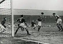 Dick scoring with a header against Everton at Bloomfield Road on 3 January 1948.