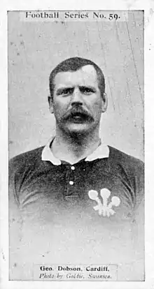 George Alexander Dobson (1873 – 8 June 1917)[1] was a Welsh rugby union forward who played club rugby for Cardiff and international rugby for Wales. Although playing in only one international, it was part of the 1900 Wales Home Nations Championship winning season, making Dobson a Triple Crown winning player.