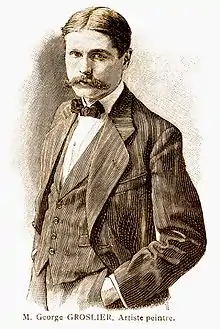 Groslier began his education in Marseilles and discovered his talents for writing and painting. At the age of seven, he attended the Universal Exposition in Lyon, which featured exhibits on French Indochina, including Cambodia.[9] He grew up with an awareness of and interest in the land in which he had been born, but no great desire to return there.[8][10] In 1904, at the age of 17, George published his first book, a self-published poetry collection entitled La Chanson d'un Jeune (Song of a Youth).[11] Beginning about 1905, Groslier attended the prestigious École nationale supérieure des Beaux-Arts, studying under classical painter Albert Maignan, who was then in his sixties.[12][13] (Groslier would dedicate his first book about Cambodia to the older painter.)[13] In 1908, Maignan supported Groslier in his bid to compete in the challenging Prix de Rome art competition. A victory in this contest would have essentially ensured a successful career, but despite advancing further in the competition than had been the case with many famous artists (e.g. Eugène Delacroix, Gustave Moreau, Édouard Manet and Edgar Degas), Groslier was eliminated at the final level, and the young painter took this as a crushing defeat.[14] However, this setback turned out to be a fortunate one, as it created the opportunity for his future career in Cambodia.