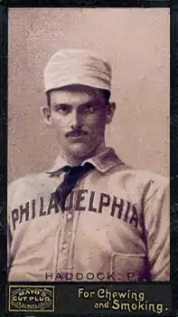 George Silas Haddock (December 25, 1866 – April 18, 1926), nicknamed Gentleman George, was a 19th-century Major League Baseball pitcher. He played from 1888 to 1894 in the Players' League, American Association and National League. Haddock played right field for the Washington Nationals against the Cleveland Spiders, on September 4, 1889. He relieved George Keefe, who worked four innings as the Nationals' starting pitcher.[1]