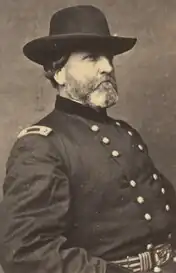 Nevertheless, Thomas stayed in the Union Army with some degree of suspicion surrounding him, despite his action concerning Twiggs. On January 18, 1861, a few months before Fort Sumter, he had applied for a job as the commandant of cadets at the Virginia Military Institute.[24] Any real tendency to the secessionist cause, however, could be refuted when he turned down Virginia Governor John Letcher's offer to become chief of ordnance for the Virginia Provisional Army.[25] On June 18, his former student and fellow Virginian, Confederate Col. J.E.B. Stuart, wrote to his wife, "Old George H. Thomas is in command of the cavalry of the enemy. I would like to hang, hang him as a traitor to his native state."[26] Nevertheless, as the Civil War carried on, he won the affection of Union soldiers serving under him as a "soldier's soldier", who took to affectionately referring to Thomas as "Pap Thomas".[27]