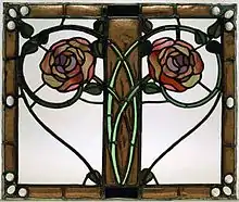 Walton's firm rapidly diversified, winning commissions in woodwork, furniture making and stained glass. From 1896 Walton partnered with Fred Rowntree, in Rowntree family projects in their home town of Scarborough. In 1896, this led to his first commission in England [12] for John Rowntree, who owned a cafe in the town.[13] This project saw Walton’s first significant foray into furniture design, including the distinctive ‘Abingwood’ chair. Walton’s style by this stage was developing restrained ornament set off against plain surfaces.[14]