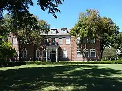 It is a two-and-a-half-story mansion complex including the house, a courtyard, and a garage, all attached to each other, with overall 80 by 180 feet (24 m × 55 m) plan. It has Georgian Revival features. Its red brick walls have brick laid in common bond.[2]