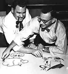 Jack Kent (l.) and George Lichty (r.) pretend to draw each other's characters in November 1951, not long after Kent had launched his King Aroo strip.