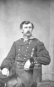 George Love enlisted in the 21st New York Volunteer Infantry on May 9, 1861, and was mustered in as the regiment's Sergeant Major on May 13, 1861.[1] He served in that duty until August 23, 1861, when he was transferred to the 44th New York Infantry and promoted to first lieutenant of Company A.[1] He was promoted to captain of Company A on January 2, 1862, and led his troops through the spring and summer of that year. On September 5, 1862, he was again promoted and transferred, to major of the 116th New York Volunteer Infantry.[1] On July 16, 1863, he was promoted to colonel of the 116th New York Infantry,[1] replacing Colonel Edward Payson Chapin, who was killed in action. While in command of his men during the October 19, 1864 Battle of Cedar Creek, Virginia, he captured the battle flag of the 2nd South Carolina Infantry Regiment, for which he was awarded the Medal of Honor on March 6, 1865.[1]