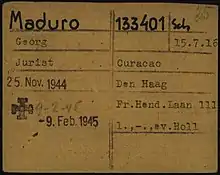 On 15 May 1940, upon the capitulation of the Dutch military, Maduro was captured by German troops and jailed in the Oranjehotel in Scheveningen.[1]