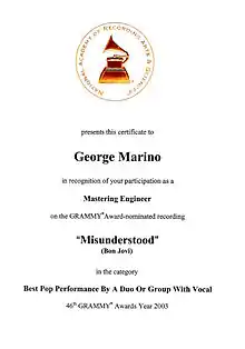 George Marino (1947–2012) was an American mastering engineer known for working on albums by rock bands starting in the late 1960s. Marino mastered and remastered thousands of albums in over forty years. He started his career at Capitol Records and was there from 1967 to 1971, then became a partner in the Record Plant's Master Cutting Room from 1971 to 1973. Marino spent the vast majority of his career mastering at Sterling Sound from 1973 until his death in 2012.[1]