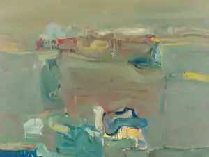 Miyasaki's paintings and lithographs from the 1950s, such as Green Landscape, in the collection of the Honolulu Museum of Art, are typical of abstract expressionism. In the 1960s, his work began to incorporate well defined forms, an example of which is Red Eye from 1963.[5] "Miyasaki's paintings radiate an expressionistic intensity derived not from the discordant drips and splashes of the spontaneous Ab Ex encounter, but from a meticulous compositional strategy that uses subtle juxtapositions of color and line to achieve an overall sense of resolution and harmony."[1] In his later Magnolia Edition collagraphs, the "muscular and delicate elements" showed that the West Coast strain of Abstract Expressionism to be every bit as vital and impressive as its New York counterpart," according to Bay Area writer Nick Stone.[6] His work is included in the collections of The Art Institute of Chicago, the British Museum (London), the Brooklyn Museum, the Honolulu Museum of Art the Metropolitan Museum of Art, the Museum of Fine Arts, Boston, the Museum of Modern Art (New York City), the National Gallery of Art (Washington, D.C), the Philadelphia Museum of Art, the San Francisco Museum of Modern Art, and the Whitney Museum of American Art (New York City).[7][1]