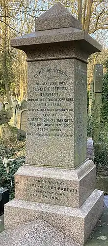 George Osborne Barratt (1827-3 October 1906) was the tenth of fifteen children of William Barratt and Caroline Jane Harriskine. The Barratts were law bookbinders at 21 Portugal Street, near Lincoln's Inn.[1] George married Sarah Peterson on 18 February 1849, at St Clement Danes, Westminster.[2] They had six girls and five boys, all born in Hoxton. The couple celebrated their golden wedding over three days in February 1899, beginning with “an excellently-prepared banquet […] to which ample justice was done”, provided by Messrs. Spiers and Pond, well known for their catering establishments.[3] On the second day some 200 male employees were entertained at a banquet in the company's main show room; followed, next day, by a similar celebration with 250 female staff.[4] After many years of illness and several operations Barratt died from jaundice at his home at Holly Mount, Crouch Hill, Middlesex on 3 October 1906, leaving an estate worth nearly £154,000.[5] He was buried at Highgate Cemetery on 5 October, alongside his wife, who was interred on 7 September 1905.