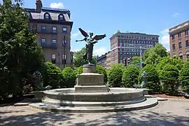 The George Robert White Memorial, also known as The Spirit of Giving, is an outdoor memorial commemorating George Robert White by sculptor Daniel Chester French and architect Henry Bacon, installed in Boston's Public Garden, in the U.S. state of Massachusetts. The 1924 bronze sculpture depicts an allegorical winged female on a Rockport granite base, above an elliptical-shaped granite and pebble fountain. It was surveyed as part of the Smithsonian Institution's "Save Outdoor Sculpture!" program in 1993.[1] The fountain was disabled in the 1980s and remained so until 2016 when it was repaired and restored by the Friends of the Public Garden at a cost of $700,000.