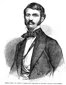 Wilkes was born in 1817 in the state of New York in the United States. It is not sure who his parents were, although they may have been George Wilkes, a cabinet maker, and Helen.[1] His family was likely of Irish origin and he had a working class background.[2] Little is known of his upbringing before he became a law clerk for Enoch E. Camp.[1] Wilkes left the legal profession for journalism, first working for a series of short-lived newspapers in New York City, the Flash, the Whip, and the Subterranean.[1] At the Subterranean, he came into contact with Mike Walsh, a politician and working class advocate who shared Wilkes' Democratic Party politics. The scholar Donna Dennis says of Wilkes at this time that he was "a clever writer, with a tempera- ment that was at once ambitious, adventurous, and entrepreneurial".[2]