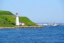 Georges Island Lighthouse is a prominent concrete lighthouse, built in 1917 on Georges Island in Nova Scotia, replacing an earlier tower built in 1876. The light-keeper's house remains standing a few hundred feet to the north.[3] The lighthouse is operated by the Canadian Coast Guard.