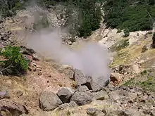The geothermal areas in Lassen Volcanic National Park include several groups of hot springs and fumaroles, as remnants of former volcanic activity, exist in Lassen Volcanic National Park in northeastern California. Most of these lie in or are closely adjacent to Mount Tehama's caldera. Bumpass Hell is the most spectacular of these, but others of importance are Sulphur Works, Little Hot Springs Valley, Boiling Springs Lake and Devil's Kitchen. In each thermal area, the highest temperature of water generally is close to the boiling temperature at the altitude of the particular spring or fumarole — 198 °F (92 °C) at Bumpass Hell and 191 °F (88 °C) on the northwest flanks of Lassen Peak.[1] Temperatures as high as 230 °F (110 °C) have been recorded in the park.