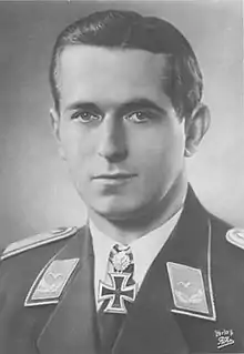 On 2 November, the Gruppe moved to Taganrog where they stayed until 1 January 1942.[21] On 18 December 1941, Köppen was awarded the Knight's Cross of the Iron Cross (Ritterkreuz des Eisernen Kreuzes), the first pilot of III. Gruppe to receive the distinction.[22][23] He had qualified for this distinction after 40 aerial victories.[24][25] The presentation was made by General der Flieger Kurt Pflugbeil.[2] By the end of 1941, his total number of aerial victories had increased to 62, making him the most successful fighter pilot of III. Gruppe.[26]