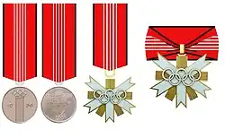 Of the three classes, the First Class was presented as a neck order. A total of 767 were presented. The second class was open to persons who played a significant, but lesser role as to the work which went into the presentation of the games. A total of 3,364 were awarded. The German Olympic Commemorative Medal (German: Deutsche Olympia-Erinnerungsmedaille) was established to recognize service in connection with the preparation work and execution of the game events. The medal was not restricted to German nationals. All classes could be worn miniaturized on a ribbon bar.[6] Modern German law prohibits the wearing of a swastika, so in 1957 the German federal government authorised replacement decorations in place of the swastika version; which still exists and can be worn as a civil decoration.[7]