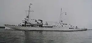 In 1992 the Hela was probably the last still active larger surface ship of the former German Navy, albeit under a foreign flag. The armament, such as the two 10.5 cm guns on the fore and aft deck, however, had already been removed. On 26 February 1995, a fire broke out in the engine room, which the crew could not extinguish and which caused severe damage.[1] Since the ship was no longer maneuverable under its own power, it was reclassified as a residential ship PKZ-14 in January 1996 and then no longer used as a command ship or government yacht. In the period that followed, up to 2006, the ship was hardly serviced and rusted away.