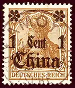 German post offices in China (German: Deutsche Post in China) started to operate in 1886. Initially definitive stamps were used without overprint; such a stamp used in China is only recognizable by its cancellation. In 1898 stamps were issued with a diagonal overprint reading "China". From 1900 onwards, stamps of the Germania definitive series were issued with new style of horizontal "China" overprint. After 1905, a third "Gothic" style of "China" overprint was applied to Germania stamps which also obliterated the stamps' face value as stated in German mark and pfennig values, and replaced them with equivalent face values in Chinese dollars and cents. All German post offices in China closed after China declared war on Germany on 16 March 1917 if they were still operating on that date.[4] Some had closed prior to this.
