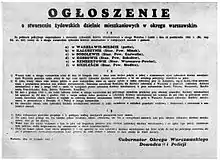 On October 28, 1942, the Supreme Commander of SS and the Police in the General Government SS-Obergruppenführer Friedrich Wilhelm Krüger (HSSPF "Ost") issued a regulation on the creation of so-called remnant ghettos in selected cities of Lublin and Warsaw districts.[16] On November 10, 1942, a similar decree was issued for the districts of Kraków, Radom and Galicia.[19] In § 3 of these regulations, the threat of the death penalty is repeated for people providing shelter or food to Jews who hide outside the designated housing districts. At the same time, unspecified police sanctions (sicherheitspolizeiliche Maßnahmen) were announced against people who do not inform the occupation authorities about the known fact of Jewish presence outside the ghetto (in practice, this meant deportation to a concentration camp). At the end of 1942, a similar decree for the Białystok district was announced by gauleiter of East Prussia Erich Koch. Strict penalties for helping Jews were also imposed in the Warta Country.