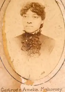 Born in Indianapolis, Indiana about 1864, Gertrude Mahorney was the daughter of John Todd Mahorney (1829–1890) and Ann Elizabeth Gray Mahorney (c. 1834 – 1904).[9][10] Her parents owned an ornamental hair (wig) business on Illinois Street near the prestigious Bates House and were active in the antislavery National Negro Convention movement. John Mahorney entered the real estate business,[11] was an author[12] and was the first African-American in Marion County to become active in local Democratic politics.[13][14] He was active in the labor movement, organizing the first African-American Knights of Labor assembly in Indianapolis. Gertrude was raised in the household with her step-grandmother, Johanna Gray, a Prussian and German speaker so that Gertrude became proficient in German.[15]