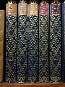 Der Gesamtkatalog der Wiegendrucke (English: The Union Catalogue of Incunabula) (abbreviated as GW or GKW) is an ongoing project of the Staatsbibliothek zu Berlin and appears in conjunction with the print edition of the union catalogue of incunabula.[1] The Gesamtkatalog serves as a bibliography or collection of cradle prints or incunabula. The word incunabula stems from the Latin word incunabulum (place of birth or beginning). In the world of books, incunabula refer to books that were printed using metal type up to the year 1500. [2] The work is based on the description of the individual prints, each complete description consists of the bibliographic note, the collation, the description in the narrower sense, the source, and the copy. [3] The database contains all together 36,000 descriptions of incunabula, distributed over at least 3,900 articles. [4] The Gesamtkatalog der Wiegendrucke is available in part in print and in its entirety—in draft form—via an online database.