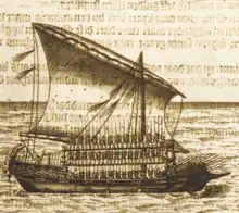 The Sultanate of Aceh is famous for the use of Ottoman-derived galleys. Aceh's term for galley is ghali, which is derived from the Portuguese word galé, not from the Turkish term for it (Kadırga).[1]: 163 The Acehnese in the 1568 siege of Portuguese Malacca used 4 large galleys of about 40–50 meters long each with 190 rowers in 24 banks. They were armed with 12 large camelos (3 at each bow side, 4 at the stern), 1 basilisk (bow-mounted), 12 falcons, and 40 swivel guns.[1]: 164 By then cannons, firearms, and other war materials had come annually from Jeddah, and the Turks also sent military experts, galleys experts, and technicians.[14] The average Acehnese galley in the second half of the 16th century would have been about 50 meters long and had two masts that were equipped with square sails and topsails, not lateen sails like those of Portuguese galleys.[15]: 106–107 [16][1]: 165 It would have been propelled by 24 oars on each side, carrying about 200 men aboard, and armed with about 20 cannons (2 or 3 large ones at the bow, with the rest being swivel guns).[1]: 165