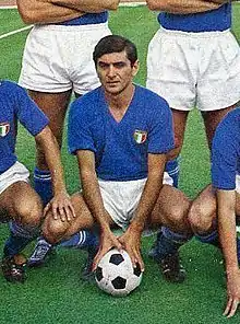 He was a member of the Italy squad that won the 1968 UEFA European Championship on home soil,[3] where his leadership and experience played an important role in the team's success, even though he did not appear throughout the final stages of the tournament; his last international appearance came against Romania, in 1967.[5][11] He made a total of 29 appearances for the Italy national side, scoring 7 times.[3][10]