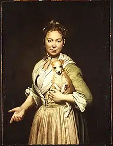 A characteristic painting is his Woman with a Dog which portrays a rather plain subject sympathetically and without idealization. Like most of his figures, she appears before an undifferentiated dark background; when Ceruti attempted to represent deep space, the results were frequently awkward. His landscape backgrounds resemble stage flats and are often copied from print sources, such as the engravings of Jacques Callot. The realism Ceruti brought to his genre paintings also distinguishes his portraits and still lifes, while it is less apparent in his somewhat conventional decorative paintings for churches, including frescoes for the Basilica Santa Maria Assunta of Gandino and an altarpiece for Santa Lucia in Padua. This limitation is not unique to Ceruti; the Brescian painter from the late 16th century, Giovanni Battista Moroni, was similarly known for expressive portraits, and drab religious paintings.