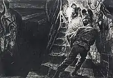 Duotone image of WWII soldiers retrieving a treasure for Argosy June, 1963: "The Greatest Souvenir"