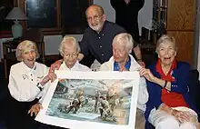Cohen sharing painting of five Women's Airforce Service Pilots (WASPs) with four WASP alumnae.