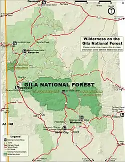 The forest lies in southern Catron, northern Grant, western Sierra, and extreme northeastern Hidalgo counties in southwestern New Mexico. Forest headquarters are located in Silver City, New Mexico. There are local ranger district offices in Glenwood, Mimbres, Quemado, Reserve, Silver City, and Truth or Consequences.[3] The Gila Cliff Dwellings National Monument is located with the Catron County section of the forest.