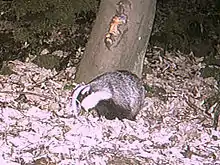 The badger is one of the most widespread and iconic animals in Britain. Most people recognise badgers by their black- and white striped head, but because they are nocturnal mammals, they are rarely seen. They do, however, roam onto Gillies Hill and signs of badger activity (heavily worn badger paths with distinctive 5-toed footprints, claw marks on trees, dung pits and coarse, wiry badger hair caught on the barbs of wire fences) have been documented. In the winter of 2011 a badger was photographed on the hill with a hidden wildlife camera. The largest threat to badgers on Gillies Hill - outside of potential quarrying and development - is the traffic that travels along Polmaise Road.[11]
