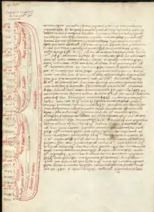 Anselmi's most famous and influential work is his dialogue on music theory written for Rossi in 1434, De musica.[10] It is preserved in a single manuscript, shelfmark H 233 Inf. in the Biblioteca Ambrosiana in Milan. This copy had been owned by Franchinus Gaffurius, whose made extensive notes in it.[11] De musica is divided into three parts on the music of the spheres (de harmonia coelesti), on musical instruments (de harmonia instrumentali) and on singing (de harmonia cantabili). The philosophical first part is influenced by Boethius' De institutione musica. In the second part Anselmi discusses tonality and various instruments, including the ancient cithara and monochord. In the third part he proposes a new system of mensural notation, which never caught on, although it was reproduced as late as 1613 in Pietro Cerone's Melopeo y maestro.[2] De musica was a major influence on Gaffurius.[7]