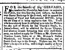Giovanni Battista Gervasio (c. 1725 - c. 1785) was an Italian musician and composer. Born in Naples he was one of the first generation of virtuoso-mandolinists who left Italy and played the mandolin in Europe in the 18th century.[1][2] He was a composer for the mandolin and his works can be found scattered in 18th century collections such as the Gimo music collection and the Bibliothèque Nationale de France.[3][4] He also wrote a mandolin method Methode facile pour apprendre a quatre cordes, instrument pour les dames (Easy method for learning four-string instruments for ladies), published in Paris in 1767.[5] He performed in London 1768 and in Frankfurt-on-the-Main on December 10, 1777, and the Concert Spirituel in Paris on December 24, 1784 .[1][5] He advertised in 1785 that he was master of singing and mandolin to Her Royal Highess, the Princess of Prussia.[5] A work of music addressed to her exists today in the Bibliothèque Nationale de France.[3]