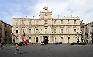 The ground floor of the Palazzo degli Elefanti in Catania (already in construction when Vaccarini came to the project) shows the decorated rustication in a 16th-century Sicilian fashion. The ground floor pilasters continue but unrusticated, the cornice they support is entirely in accordance with Roman contemporary design, as are the windows. The windows on the piano nobile have straight, but broken, pediments with canted sides, a theme commonly reproduced by Vaccarini in ensuing years. The free-standing columns supporting a straight balcony endow a pompous grandeur to the entrance. The balcony was to become a feature of Sicilian Baroque; it was later to take many shapes, often curved, serpentine, or a combination of both juxtaposing. Such balconies were often decorated with elaborate wrought-iron balustrades. He also designed a number of the buildings around Piazza dell'Università such as the Palazzo dell'Università (Sicolorum Gymnasium) and Palazzo San Giuliano.