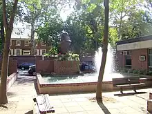 The park with the fountain and the bust of Franklin in the background in October 2009