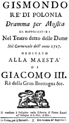![]() Frontispiece from the libretto of the 1727 Rome premiere of Gismondo, Rè di Polonia | |