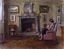 Mascarini's works can be found in various public and private collections in Milan. The Gallery of Modern Art owns four paintings: Violetta e Nonna e nipotina, bought for the autumn social exhibitions at Permanente in 1918 and 1935, a Portrait of Mr Carlo Canali (Ritratto del signor Carlo Canali), donated by his widow in 1920 and a Portrait of Mrs Maria Luisa Grubicy (Ritratto della signora Maria Luisa Grubicy), bequeathed by Alberto Grubicy, Vittore Grubicy de Dragon's brother.[8] The Raccolte d'arte dell'Ospedale Maggiore contain four portraits of his benefactors (Camillo Crespi, Giovanna Gargantini dal Verme, Lorenzo Brera and Luisa Vacchelli Rocco).[9][10] In 1955, one of his paintings (Indoors) was purchased by the art collection of Fondazione Capirlo.[4][11]