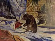 The subject matter of Gladys Johnston's paintings deal with the local geography of the places she lived in and around British Columbia, adventure scenes (such as a man in a canoe encountering a bear, a man being thrown from a horse), nature and other homesteading scenes. She kept several scrapbooks and diaries. The scrapbooks were filled with sketches and pages torn from popular magazines. Her diaries included records of things seen while traveling and lists of chores. These are written in a straightforward, yet often poetic, fashion.[7]