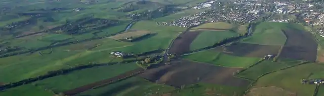 The fortlet (55°55′53″N 4°11′03″W / 55.9314°N 4.1842°W / 55.9314; -4.1842) can sometimes be seen in photographs taken from aircraft which have been taken at various times since 1955.[7] Nothing identifiably Roman can be seen at the site anymore.[8] There have been no excavations to date. Aerial photography has however highlighted an area of around 20 m square, which could have been secured with the help of the turf rampart with its ditch. It has been speculated that a bridge, across the ditch, may have granted admission to the frontier. The site of the fortlet is just east of the bridge over the Forth and Clyde Canal which carries the A803. Kirkintilloch is east of the site with Low Moss to the south.[9] There is a temporary Roman camp at Easter Cadder about one-half mile (one kilometre) away. This is on a raised piece of ground approximately mid-way between the Glasgow Bridge fortlet and the main Roman fort at Kirkintilloch.[10] If walking west, the line of the Wall changes course after the site of Glasgow Bridge Fortlet.[11]