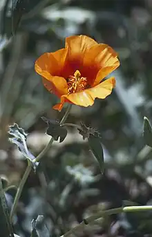 The species is a perennial flowering plant which has scalloped, blue-gray leaves. It flowers in the summer and fall with orange-red flowers that are 4 centimetres (1.6 in) in diameter. These flowers are on long stems which extend above the plant's foliage. The seed pods ripen in late summer.[2]