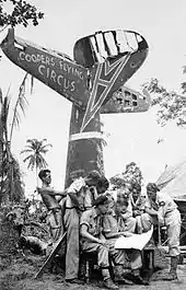 "Coopers Flying Circus": Squadron Leader Cooper (middle) with members of No. 80 Squadron in New Guinea, July 1944