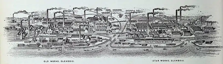 Glenboig's main industry was fireclay, centred on the General Refractories and Glenboig Union Fireclay Company Limited's Star Fireclay Works, which made refractory products for the steel and iron industries. Aerial photographs[9] of the works are available. The Glenboig Union Fire-clay Company Limited dates back to 1836.[10]