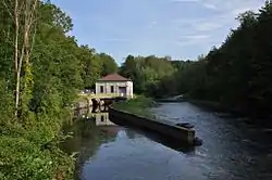 The power plant was built in 1905 by Monument Mills of Housatonic, at the site of a dam that dated to the 1840s for a papermaking operation. The stone building uses stone originally quarried for the Glendale Woolen Mill. By 1909, this plant was providing half of the mills' power requirements. The power station was taken out of service in 1946, and most of its original generation equipment removed.[3] The property was redeveloped to provide hydroelectric power to the main grid in the 1980s.[3] Its four turbines can produce 1.07 MW of electricity.[4] Electricity generation depends on the availability of water; during a drought, the water level might fall too low to run the turbines.