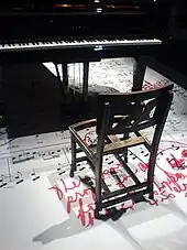 The piano had to be set at a certain height and would be raised on wooden blocks if necessary.[45] A rug would sometimes be required for his feet.[46] He had to sit exactly 14 inches (360 mm) above the floor, and would play concerts only with the chair his father had made. He used this chair even when the seat was completely worn.[47] His chair is so closely identified with him that it is shown in a place of honour in a glass case at Library and Archives Canada.
