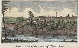 A post office was established in 1808.[6] Glens Falls became an incorporated village in 1839,[6] and was re-incorporated in 1874 and 1887, expanding the village to what would become the city limits[9] when the state legislature granted the city charter in 1908,[9] at which time the city became independent from the town of Queensbury.