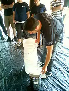 In Sichuan Province where more than 10 million people were affected, the quake damaged over 1,200 water treatment plants and more than 800 water storage tanks, as well as some 5,000 kilometres of buried water pipes. The earthquake and its aftershocks severely compromised the supply of safe drinking water.[5] Operating from the provincial capital of Chengdu, GlobalMedic's team helped set up and operate some 140 Noah Trekker suitcase-sized purification units in the area, each capable of supplying safe drinking water for about 1,000 people. They also brought in a much larger Nomad purification unit with a flow rate of 100 litres per minute, capable of serving some 70,000 people. Its volunteer staff further coordinated the distribution of almost 22 million Aquatab water purification tablets, each capable of disinfecting a litre of contaminated water.[54]